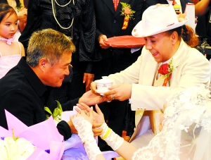 昨天的婚礼形式可谓中西结合,上午9点半先进行的是中国古典婚礼仪式。新郎用八抬大轿迎娶遮着盖头的新娘,100多米长的迎亲队伍吹吹打打好不热闹,赵本山从东北带来的19名唢呐手更是扭动着身体卖力助阵。10点整,赵本山、杨少华与新娘的双亲在保镖的守护下端坐殿堂正中,新人在司仪的指引下完成了射箭、迈火盆等传统仪式,随后赵本山起身亲手为舞狮点睛,热闹的场面惹得上百群众围观拍照。赵本山一边笑呵呵地看着爱徒进行仪式,一边躲闪冲破警戒线要求合影的人们,原本心力交瘁的老赵无奈地说:“这到底是看谁结婚啊?”
