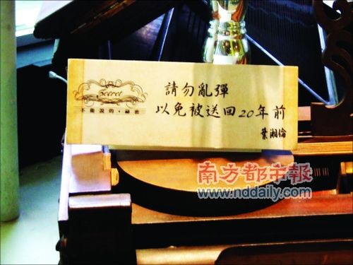 摆上剧中的道具,自然让粉丝蜂拥而至,来店消费必然围着钢琴左拍右拍,有时候甚至要弹弹琴才过瘾,“因为这是古董钢琴,所以杰伦很珍惜,还是有些怕人弄坏了,所以他就写了这张纸条,要我们放在钢琴上,”摆在钢琴上的是一张打印出来的纸条,不过内容是周杰伦写的———“请勿乱弹,以免被送回20年前———叶湘伦”。