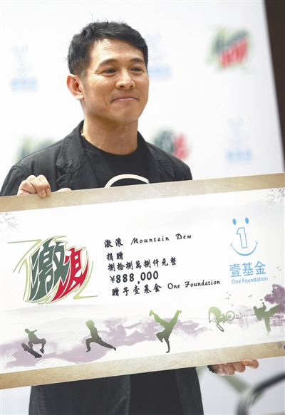 李连杰以招牌式的笑容,代表壹基金接受了捐赠。信报图