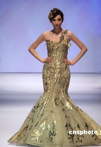 7月2日,在上海举行的一知名品牌婚纱发布会上,一款价值3000万元人民币的“黄金婚纱”吸引无数目光。据悉,该婚纱由黄金丝线全手工缝制,全世界只有2件。图为艺人吴佩慈身披“黄金婚纱”展现迷人风采。 中新社发 汤彦俊 摄