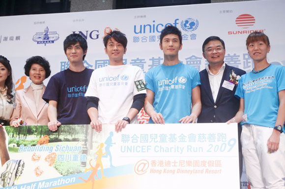 8月5日在香港铜锣湾时代广场,联合国儿童基金香港委员会举行了爱心大使委任礼暨联合国儿童基金会慈善跑记者会,现场委任黄晓明、周渝民及孙耀威为"联合国儿童基金香港委员会爱心大使",并为“联合国儿童基金会慈善跑”揭幕。据悉,此次赛事所筹得的善款将支援四川地震的重建项目,协助受灾儿童尽快回复到正常生活。